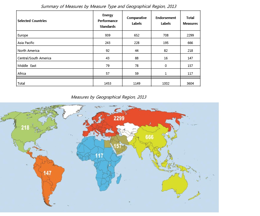 - The number of all types of Standards & Labelling measures in different countries around the world (where measures are energy performance standards or some form of efficiency labelling) have almost trebled to 3604 measures in 2013 (from 1220 measures in 2004)