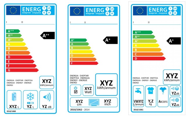 Program Information: Most products are now covered by delegated regulations, which do not require member country laws or regulations. Member States are responsible for compliance, educational and promotional activities. Product suppliers need to provide proof of appliance efficiency and make informational available in the form a product fiche. The requirement for a label also applies to products for hire (but not for second hand products), and a set of information to be provided on internet is also specified, where the label is not displayed. A new directive for the label display on internet is under preparation. For any advertisement, the product´s energy class has to be specified in media, whenever the price or technical specifications are promoted. The label displays the energy consumption and rates the appliance with its comparative level of efficiency. There is no product registration system in Europe. The above far left label is for a refrigerator, the middle for a television, and the far right is for a washing machine. All labels are of similar style. The EU has moved to using pictograms rather than words for each of the performance measures included in addition to energy, due to the large number of languages used in Europe (the EU labels are regarded as "language neutral").