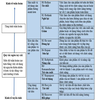Hình 1 là danh sách của R được sử dụng trong việc thực hiện kinh tế tuần hoàn. Tất cả các danh sách R đều giống nhau và khác nhau chủ yếu ở số lượng chiến lược tuần hoàn mà họ đưa ra. Họ thường trình bày một loạt các chiến lược được sắp xếp từ tính tuần hoàn cao (số R thấp) đến tính tuần hoàn thấp (số R cao). Chiến lược R0 và R1 giảm tiêu thụ tài nguyên thiên nhiên và vật liệu được áp dụng trong chuỗi sản phẩm bằng cách cần ít sản phẩm hơn để thực hiện cùng một chức năng. Do đó, R0 và R1 thường được coi là chiến lược tuần hoàn, mặc dù chúng không nhất thiết liên quan đến việc tăng cường tái sử dụng các sản phẩm và linh kiện hoặc áp dụng lại của vật liệu tái chế. Tất cả các danh sách R có sẵn đều được xây dựng trên Ladder van Lansink nhằm thiết lập mức độ ưu tiên của các phương pháp xử lý chất thải. Danh sách R trong Hình 1 là sự kết hợp của các danh sách R do Rli vẽ ra (2015) và Vermeulen và cộng sự (2014). Nó cho phép xây dựng các chiến lược tuần hoàn trong chức năng chính của sản phẩm được duy trì. Hình 2 thể hiện các điểm trong một chuỗi sản phẩm có liên quan đến các chiến lược tuần hoàn khác nhau và các tác nhân trong chuỗi đóng một vai trò trong những chiến lược đó.